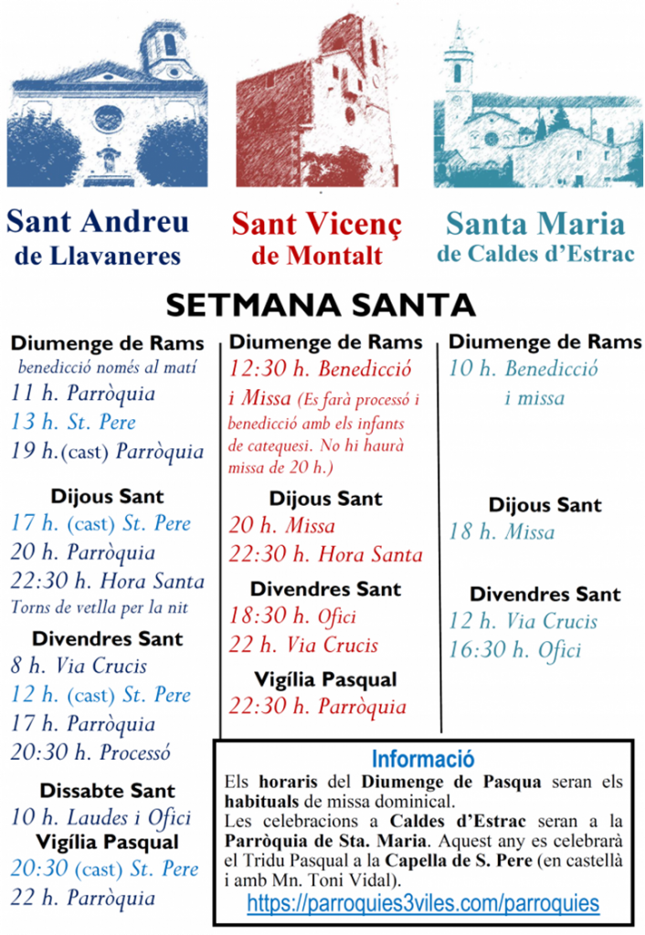 Vida parroquial LL = St. Andreu de Llavaneres | SV = St. Vicenç de Montalt | CA = Sta. Maria de Caldes d’EstracBateig. Blanca Kämmler (LL). Col·lecta de Mans Unides. Serà en les misses dominicals d’aquest diumenge 26 de març. Via Crucis. El darrer, a les 18 h. a St. Andreu de Llavaneres. Recital inaugural del “Cor Sacra”, de St. Andreu de Llavaneres. Diumenge 26 de març, després de la missa de 19 h. de St. Andreu de Llavaneres. 2ª Conferència quaresmal parroquial. Dilluns 27 de març, a les 19:45, a la parròquia de St. Andreu, a càrrec del Rev. Dr. Jaume González Padrós, amb títol: “La pregària eucarística. Cor i cimal de la celebració”. Anirà seguida de sopar de germanor. Cal apuntar-se en el despatx parroquial. Celebració penitencial arxiprestal. Dijous 30 de març, a les 20:30 h. a la Parròquia de St. Josep de Mataró. Divendres de Dolors, Stabat Mater de Pergolesi i benedicció de medalles de la Confraria de St. Andreu. Divendres 31 de març, dins la missa de 19 h. a St. Andreu de Llavaneres, es cantarà l’Stabat Mater de Pergolesi, i en acabat es beneiran les medalles als membres de la Confraria de St. Andreu de Llavaneres. Mercat del Ram. Venta de palmes i palmons, a St. Andreu divendres 31 a la tarda i dissabte 1 d’abril tot el dia; i a St. Vicenç de Montalt, dissabte 1 d’abril de 10 h. a 13 h. i de 18 h. a 20 h. Horaris especials de Diumenge de Rams. A la Parròquia de Sta. Maria de Caldes a les 10 h. (celebració única), a St. Vicenç de Montalt a les 12:30 h. (celebració única) i a St. Andreu de Llavaneres a les 11 h. (hi haurà també missa de 19 h.) i a St. Pere a la 13 h.
